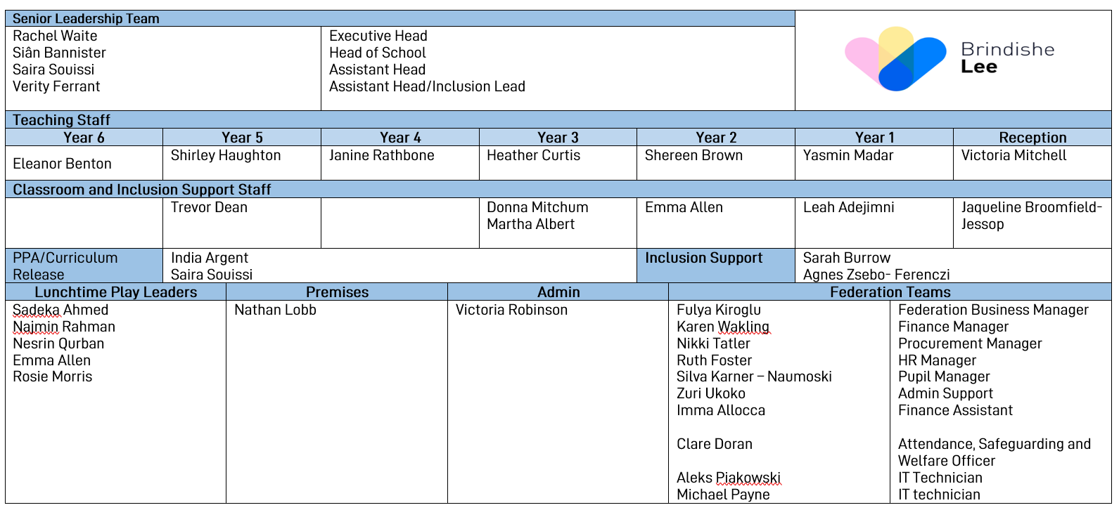 Brindishe Lee staff work together as a team. We encourage team planning and teaching and shared responsibility. The teaching staff are able to teach and work with children of all ages and share in developing areas of the curriculum and school policy. This means that all staff will get to know, and probably teach, your child at some stage of their primary school career.